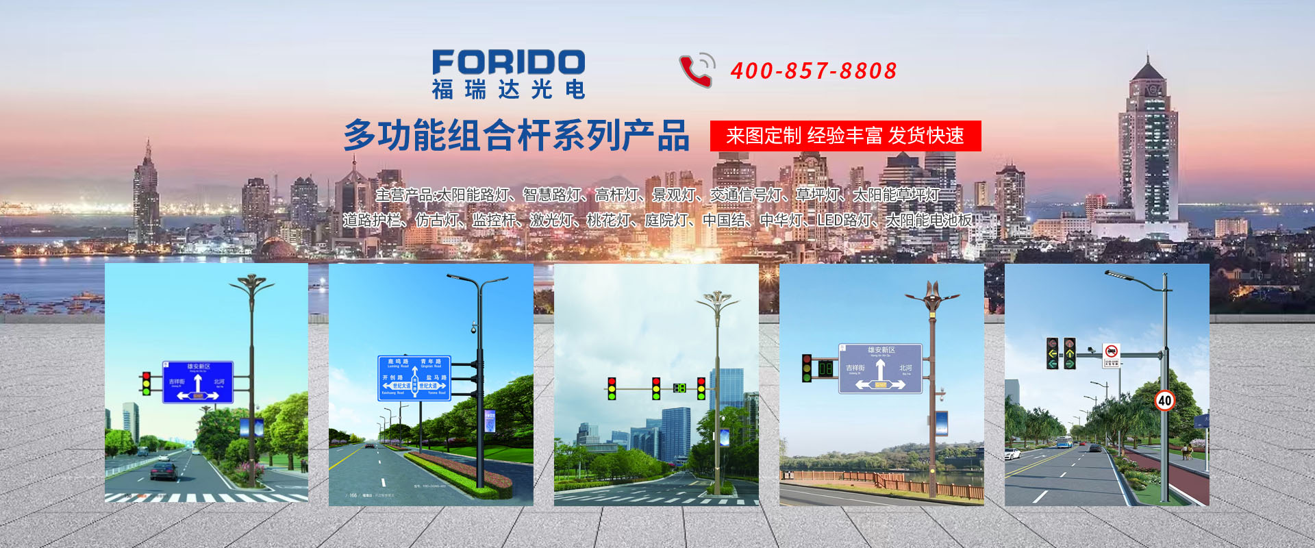 揚州福瑞達光電科技有限公司位于淮左名都歷史文化名城、中國路燈制造基地揚州市北郊菱塘工業園,公司占地面積76000平方米,注冊資金10518萬元,擁有高級技術嫻熟的員工280多人,擁有大型折彎機、激光切割、數控注塑機、壓鑄機、自動埋弧焊、氣焊、彩色粉末靜電噴塑等大型自動化設備,我公司是一家集設計、研發(fā)、生產、銷售、施工安裝服務為一體的戶外交通照明產品制造商,主要生產智慧路燈、太陽能路燈、LED路燈、高桿燈、景觀燈、交通信號燈、交通標志牌、通信鐵塔、路跨鋼結構、公交站臺、太陽能光伏組件、景點亮化、樓宇亮化工程的設計施工等。公司秉承開拓創新、銳意進取、精誠服務的企業精神,堅持以“誠信為本、技術為先、服務是金”的合作理念,我們憑借先進的制造工藝、優(yōu)質的產品質量、合理的市場價格和完善的售后服務贏得了廣闊的市場和客戶的信賴。 我公司已通過ISO9001質量體系認證、ISO14001環(huán)境管理體認證,CQC產品認證,中國節(jié)能產品認證,通過“CCC”強制性產品認證,具有市政總承包,照明,交安,設計等資質···